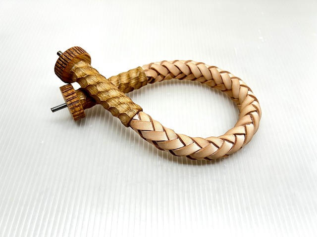 丈夫で足に優しく掴み心地のよい国産牛本革をロープ状に編みパーチに仕立てました。 根本はデザパ仕様、繊維誤飲リスクの軽減、グリップの弱い子やバンブルフットの緩和や予防にも最適な一本です。 【適応鳥種】 小型〜中型さん 【本体サイズ】 W450mm×Φ20〜23mm程度 【素材】 熊本県産樫、国産牛本革、北米産オーク、ステンレスボルト、コットンロープ 【納期】 決済後3日以内に発送 【仕様】 ・天然木無垢材を使用しておりますので色ムラ、傷、欠け、割れ、節、折れ、曲がり等があります。 ・材料は乾燥後洗浄、煮沸、動物病院でも使用される次亜塩素酸水にて消毒済みです。 ・止まり木は自然の風合いを活かした無塗装仕上げ、愛鳥さんが樹皮をかじっても安全です。 ・愛鳥さんの個体差により適応鳥種から外れる場合もございます。ご購入前にご相談ください。 ・仕様は予告なく変更になる場合があります。 【ご使用前に】 お届けした止まり木には木肌保護のため国産天然素材由来の蜜蝋ワックスを薄く塗布してございます。鳥さんの口に入っても問題ございませんが、使用前に水で濡らし硬く絞った布等で軽く拭き取ってからご使用ください。 すぐに使わない止まり木は蜜蝋ワックスを拭き取らず保管いただくことをお勧めいたします。長期間の保存でも樹皮のひび割れや乾燥劣化を防ぐ効果があります。 【お手入れ】 ・軽い汚れは水で濡らして固く絞った布等で拭き取りしてください。 ・漂白剤や強い洗剤は有毒成分が残る場合がありますのでご使用にならないでください。 【ご使用上の注意】 本製品は、小鳥がかじる行為や部品の誤飲等により思わぬ事故または傷害が発生するおそれがあります。必ず飼主様の監督のもとでご使用ください。また安全のため破損や劣化が見られた場合は直ちに使用を中止してください。 【免責事項】 本製品の使用はすべて飼主様の自己責任において行っていただきます。初期不良を除き、破損・誤飲・事故等に起因するいかなる損害に対しても当店は一切の責任を負いません。あらかじめご了承のうえご購入ください。
