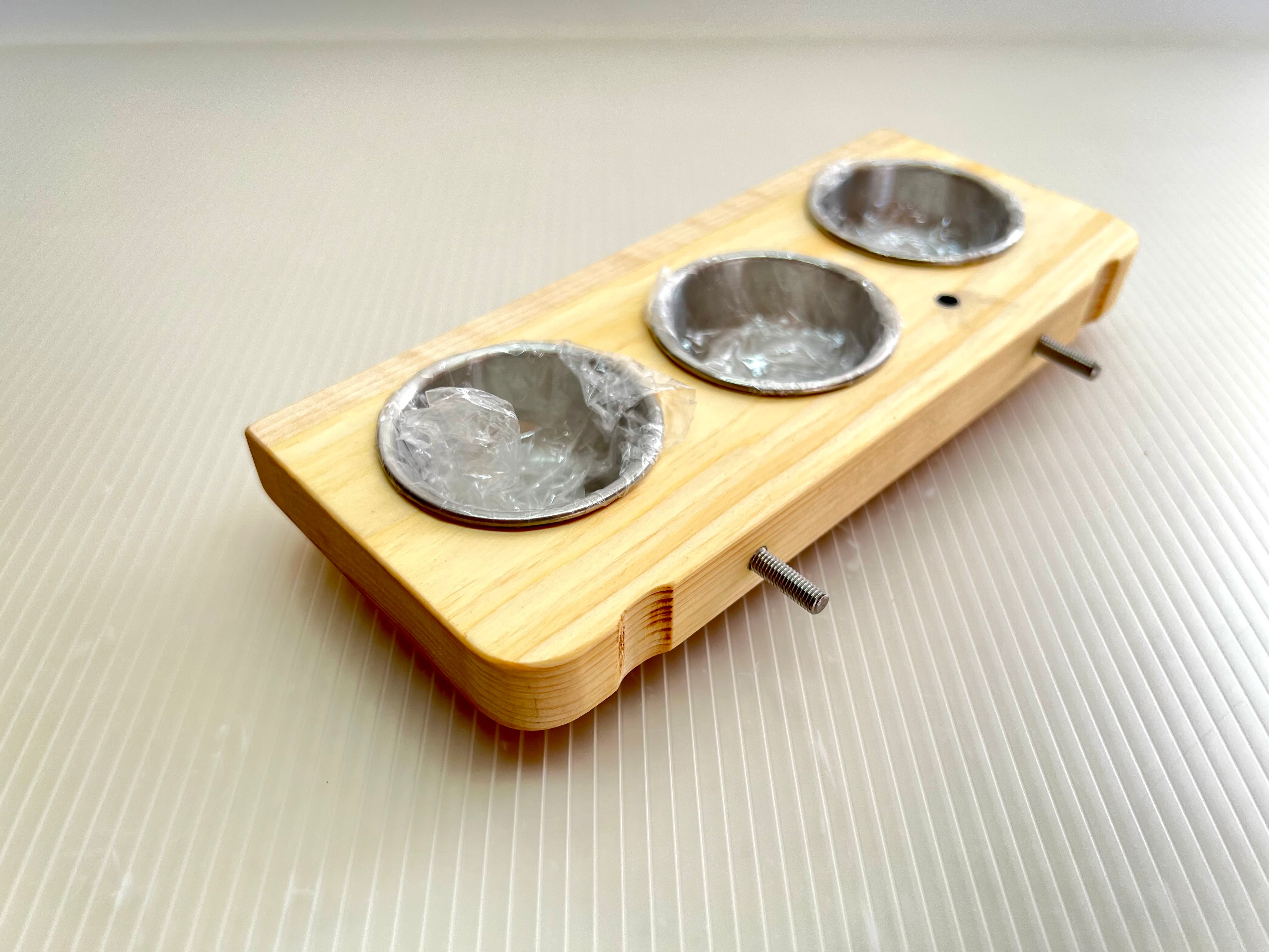 ステンレスカップをゆるい扇型に配置しペレット、シード、お水、穂、など4箇所に分けて給餌可能。