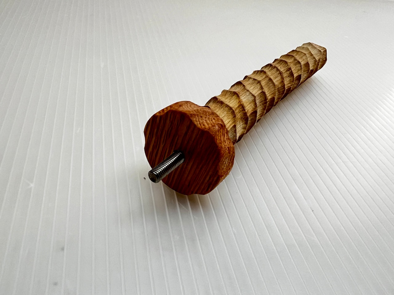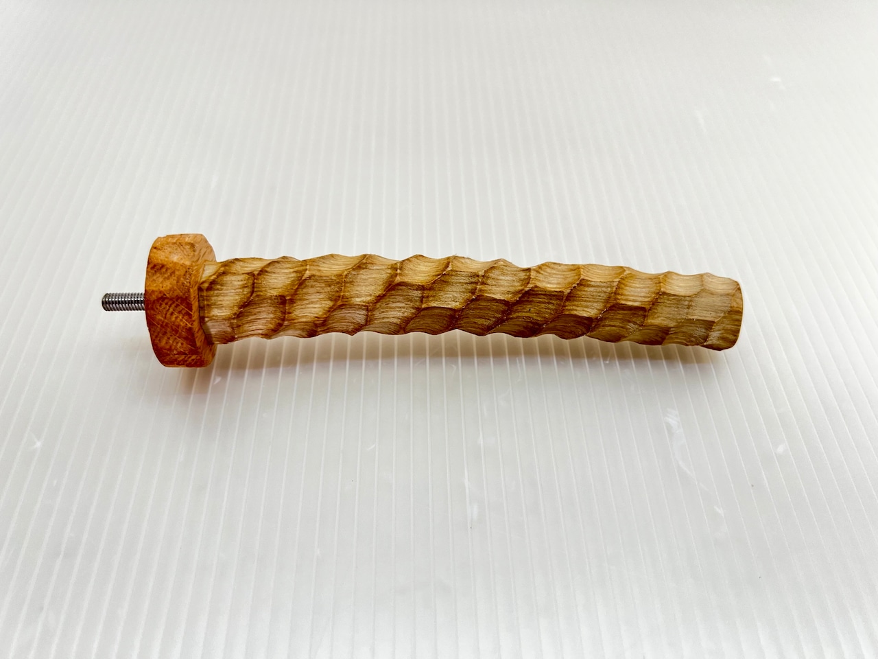 堅い樫を滑り止め効果を高めるため木肌をえぐるように多面彫り加工した特殊なパーチです。