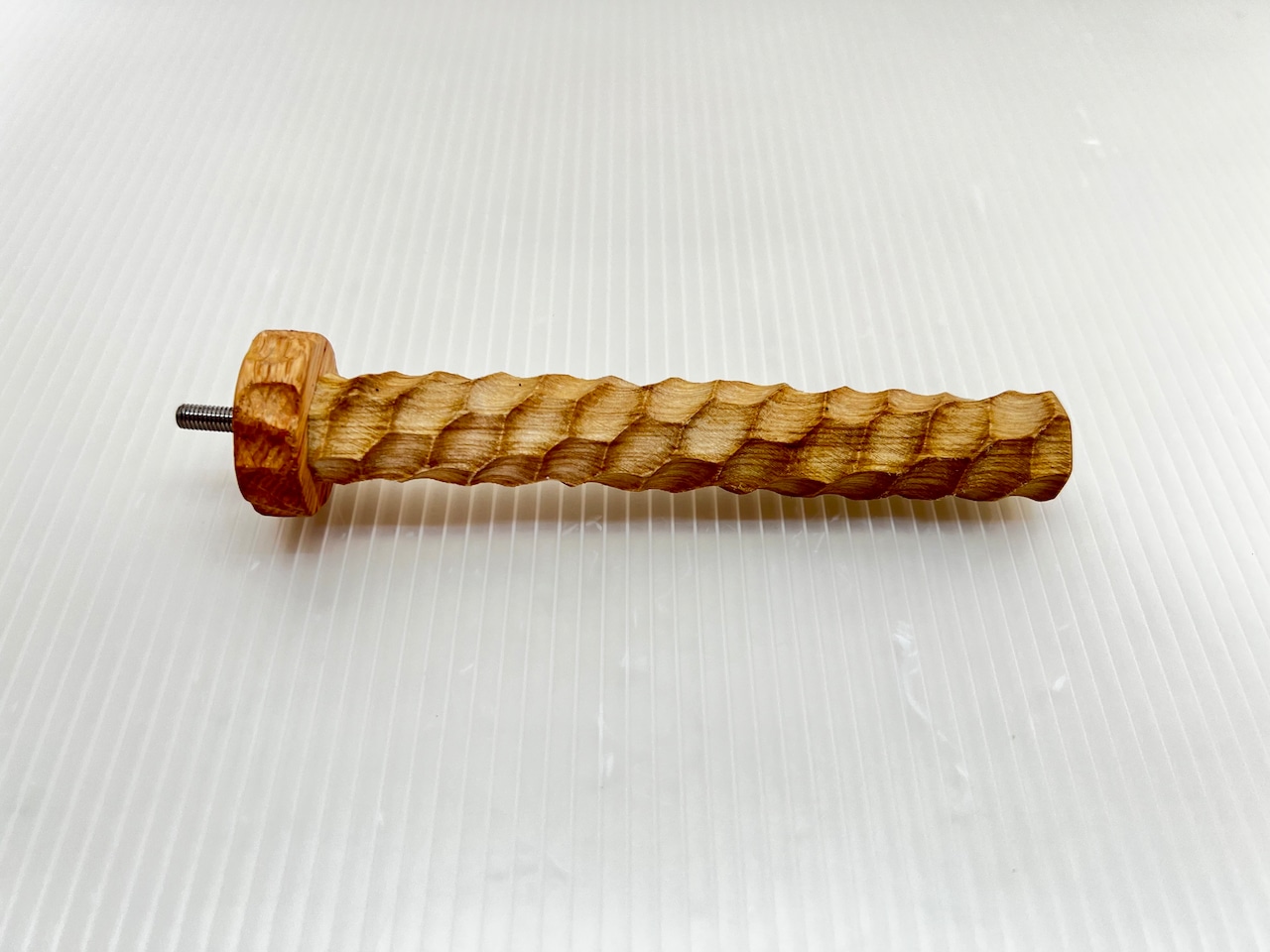 堅い樫を滑り止め効果を高めるため木肌をえぐるように多面彫り加工した特殊なパーチです。