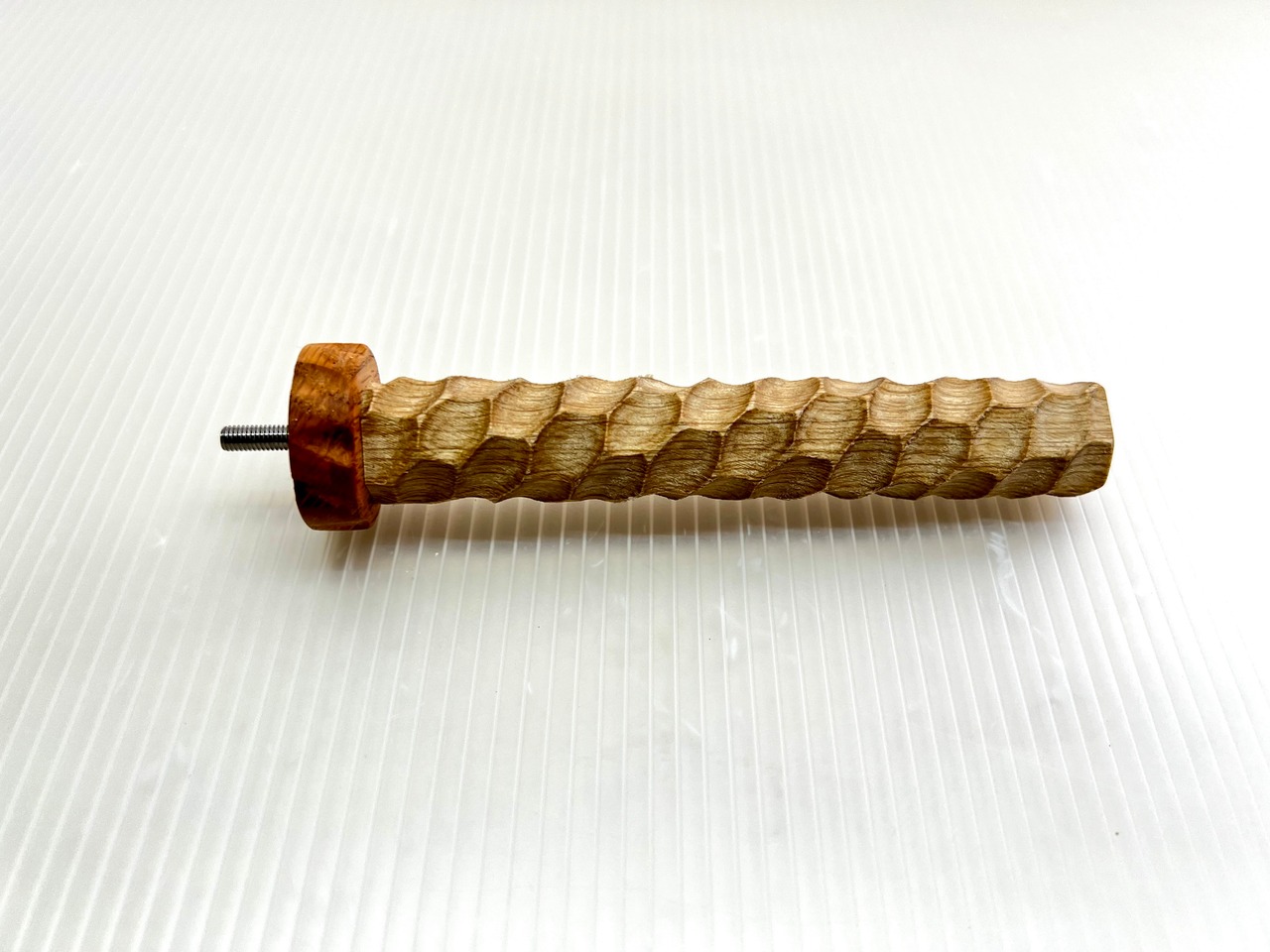堅い樫を滑り止め効果を高めるため木肌をえぐるように多面彫り加工した特殊なパーチです。