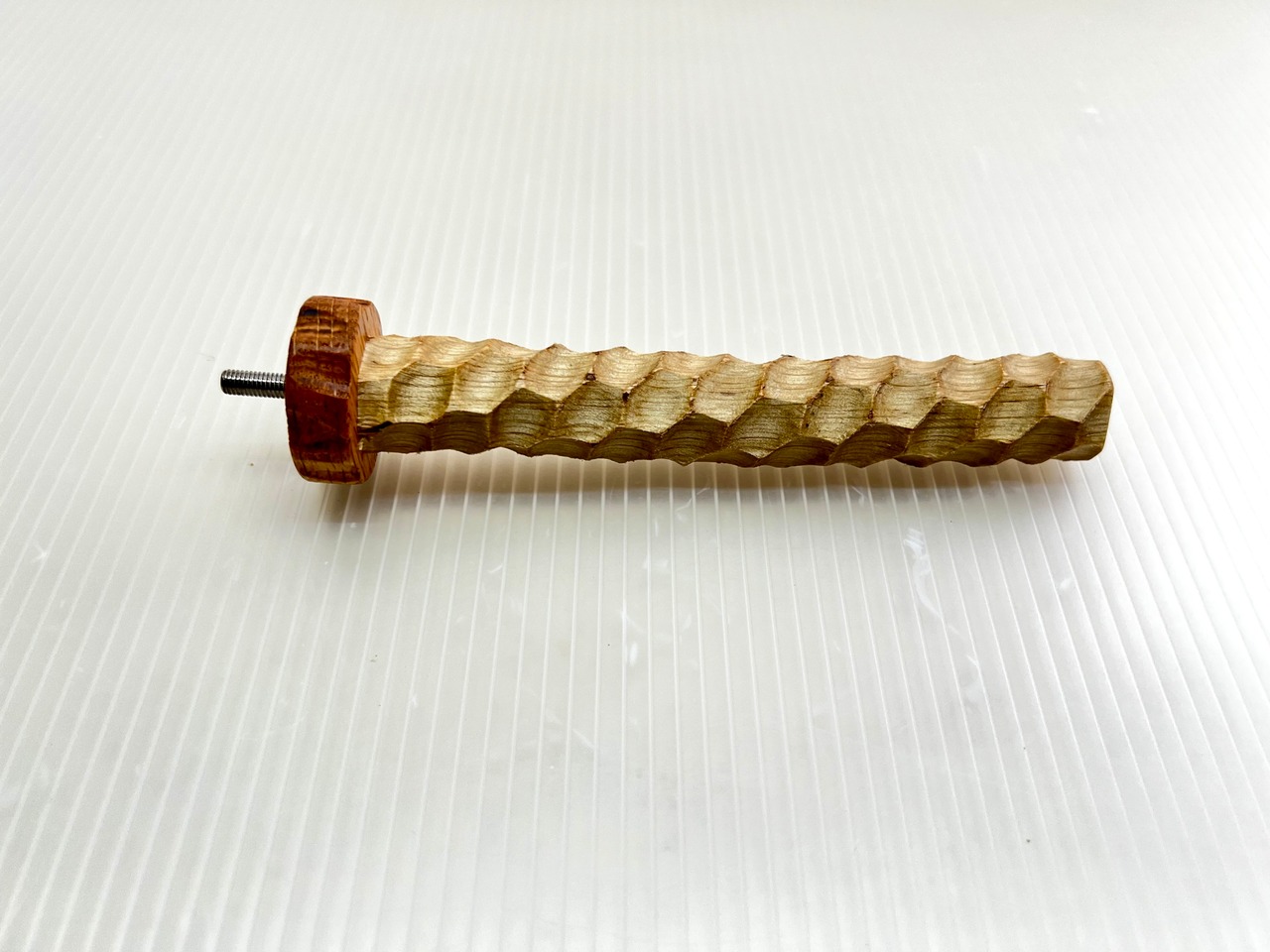堅い樫を滑り止め効果を高めるため木肌をえぐるように多面彫り加工した特殊なパーチです。