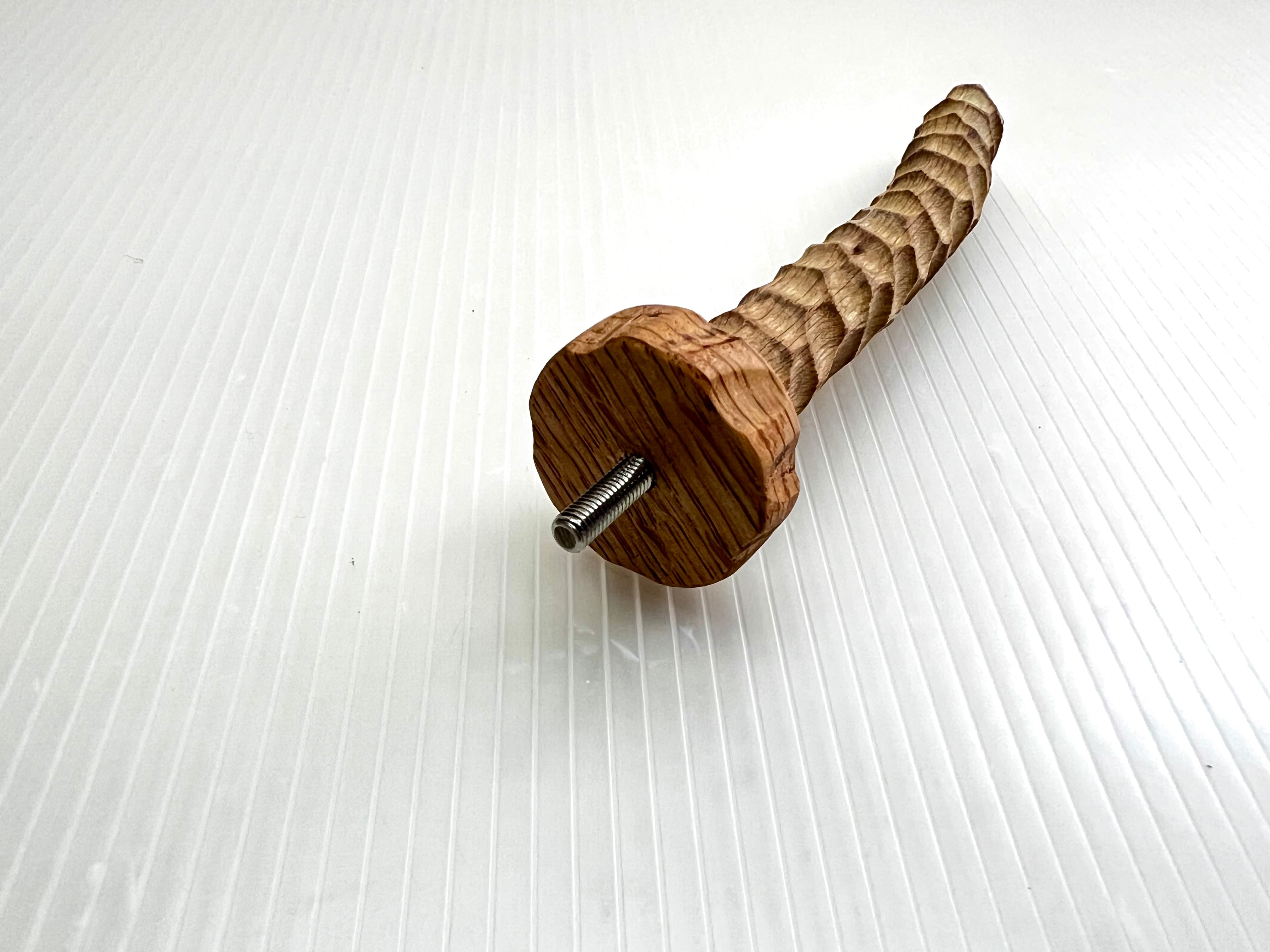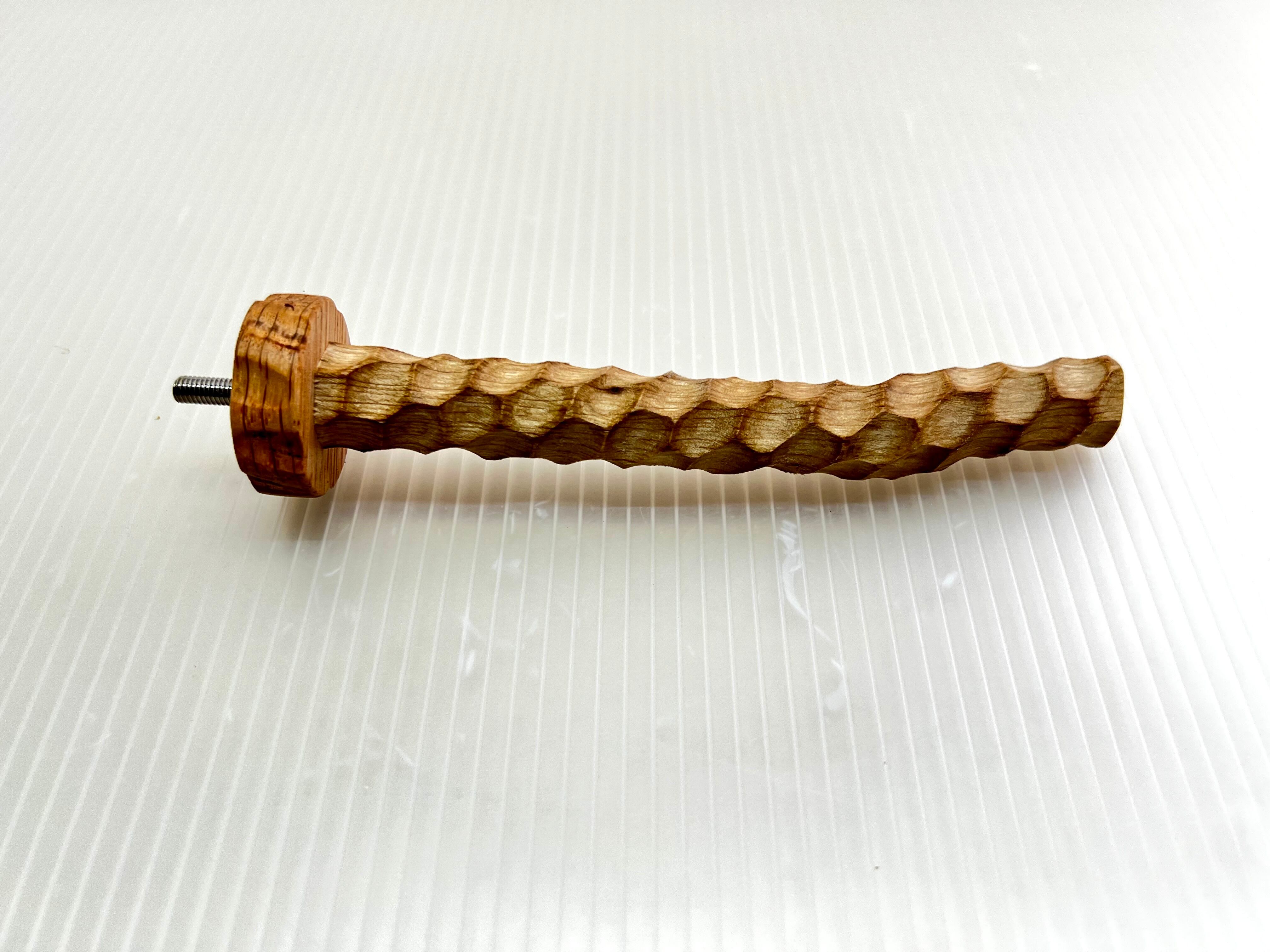 堅い樫を滑り止め効果を高めるため木肌をえぐるように多面彫り加工した特殊なパーチです。