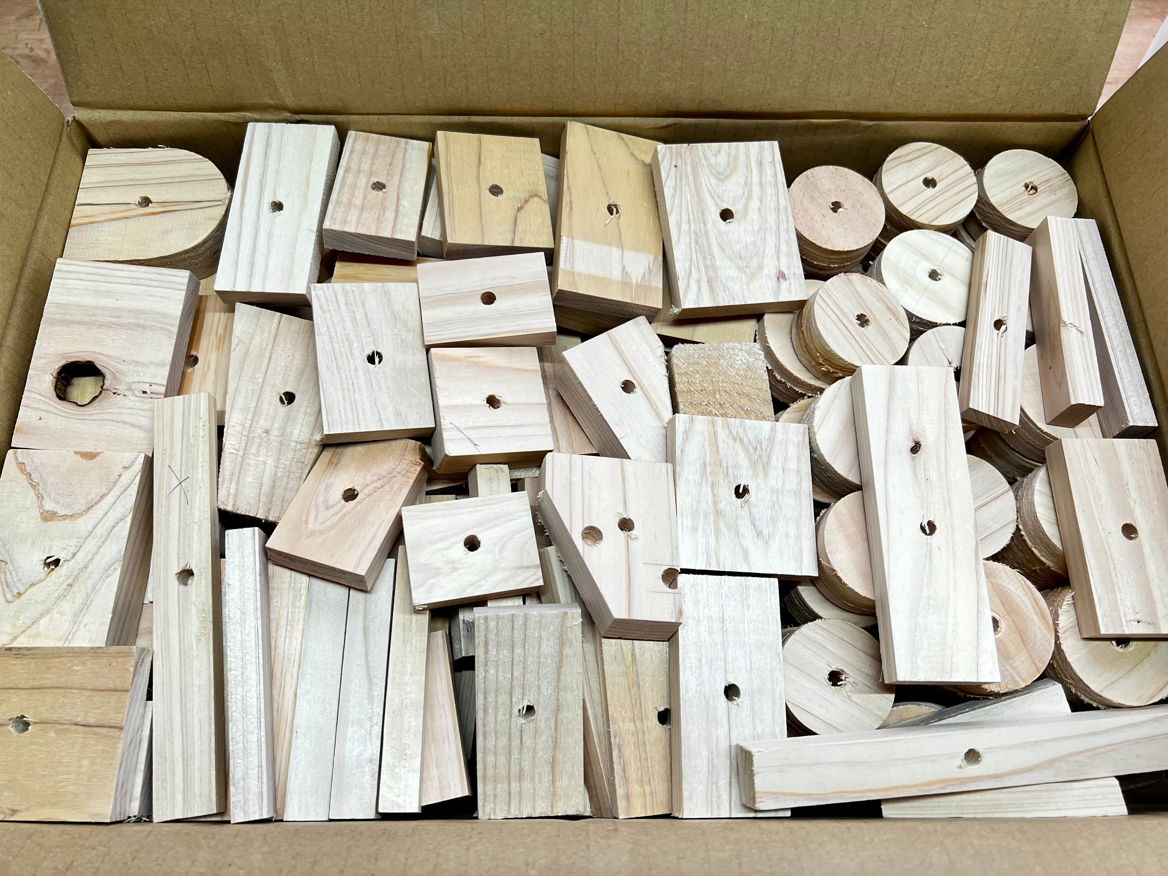 テーブルやバードジム制作で出た端材に紐を通す穴を開け、大小様々詰め合わせにしました。