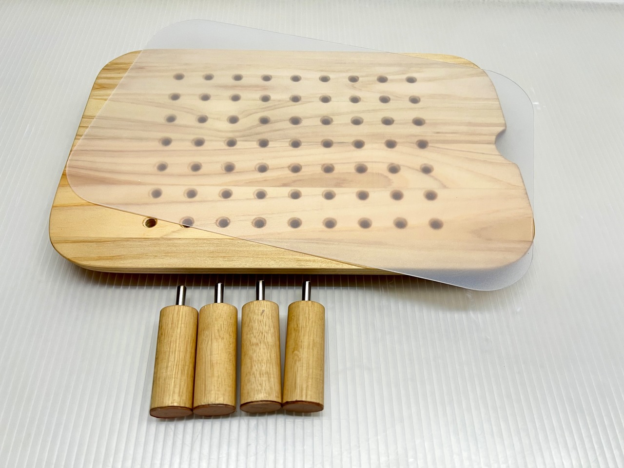 熊本県産桧、広葉樹丸棒、ステンレスロッド、PPシート、国産牛革