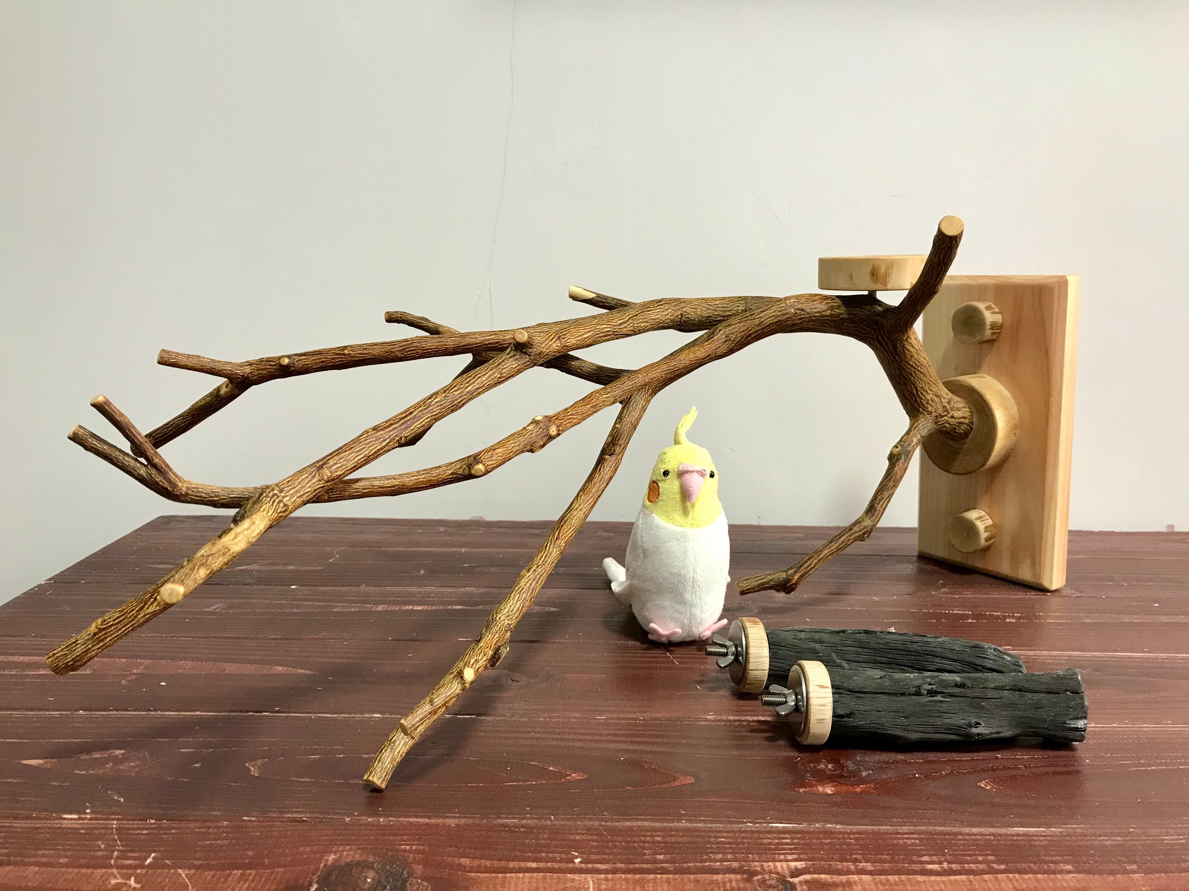 ・止まり木は自然の風合いを活かした無塗装仕上げ、愛鳥さんが樹皮をかじっても安全です。