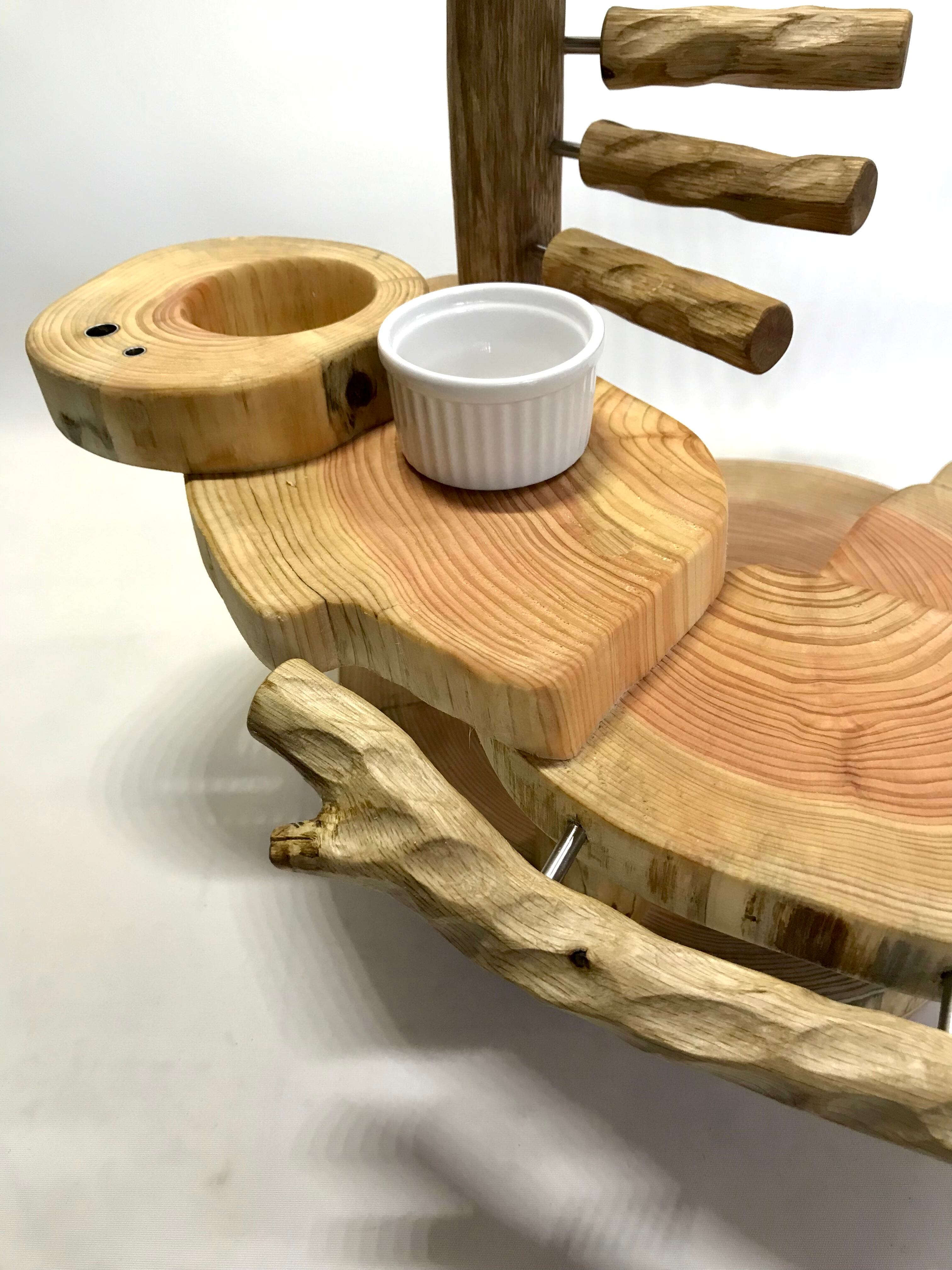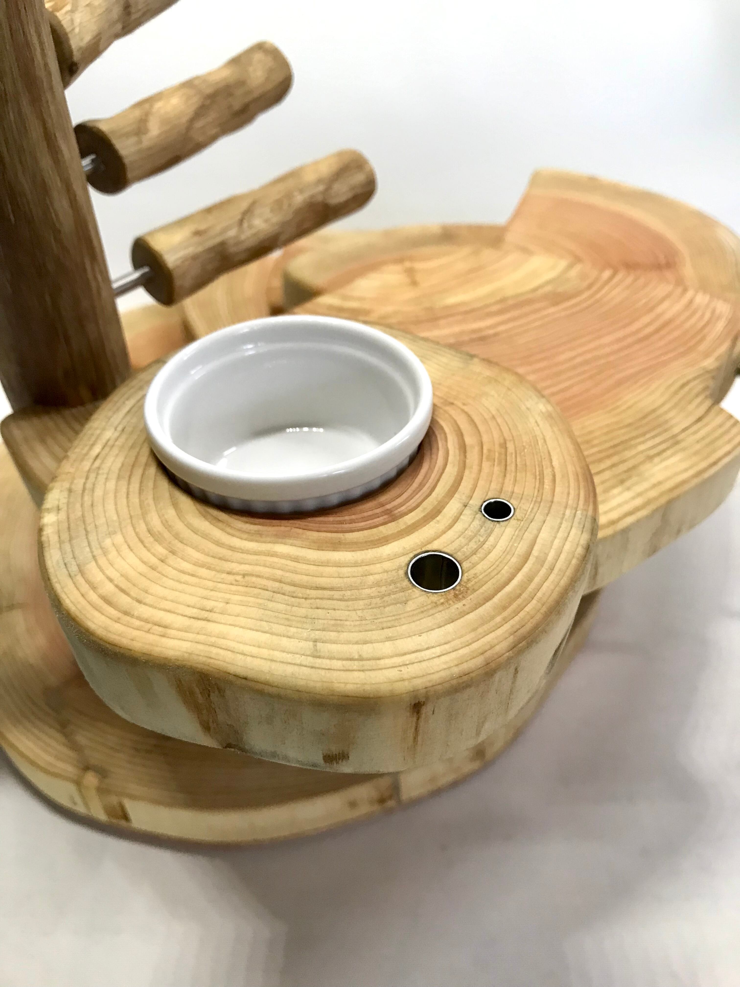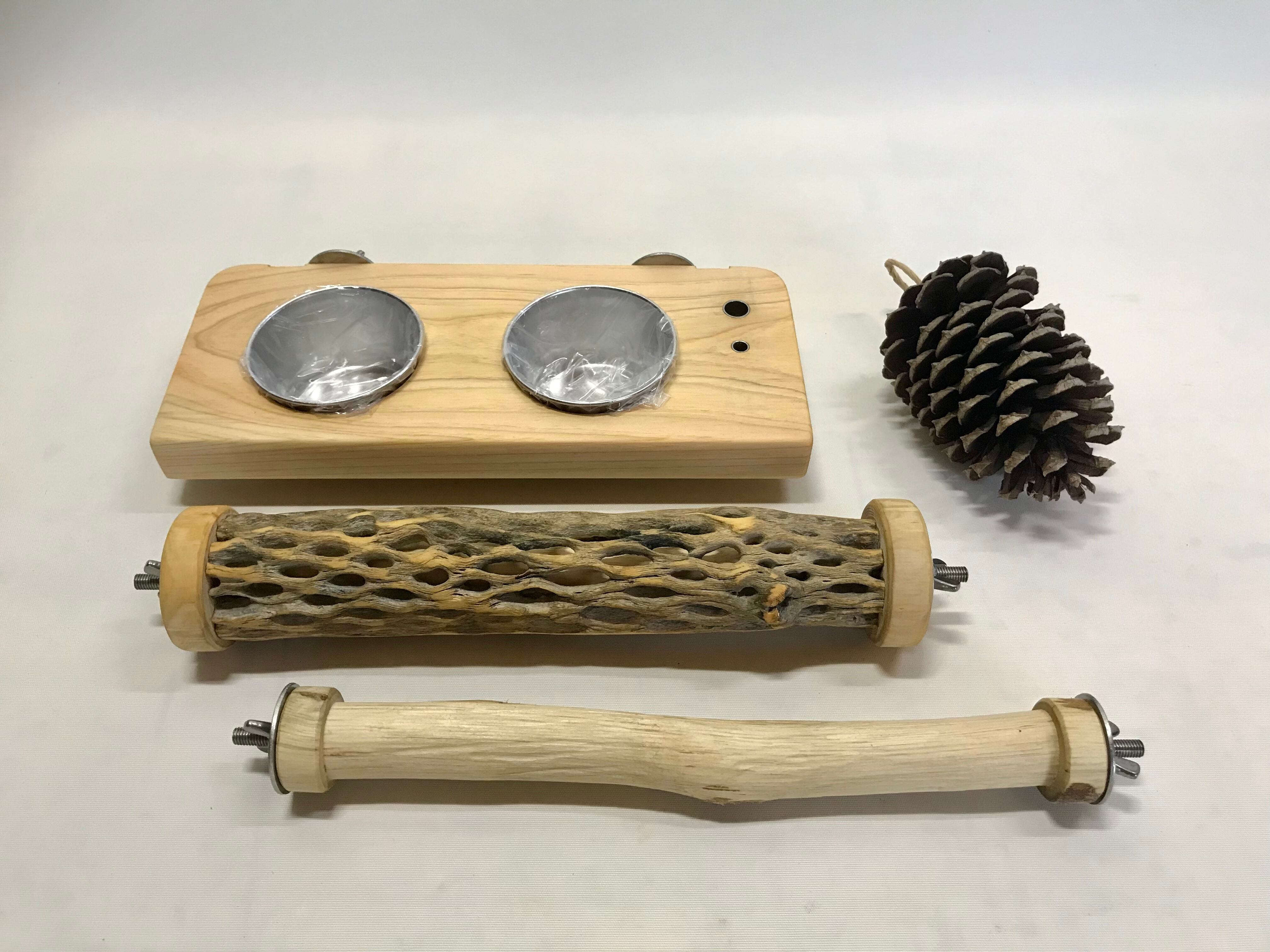 ・切り株土台(割れ防止加工)、切り株おやつテーブル、ステージ、ステップ、ステンレス穂菜挿し、3D加工パーチ、おもちゃフック、簡易フォレイジング。