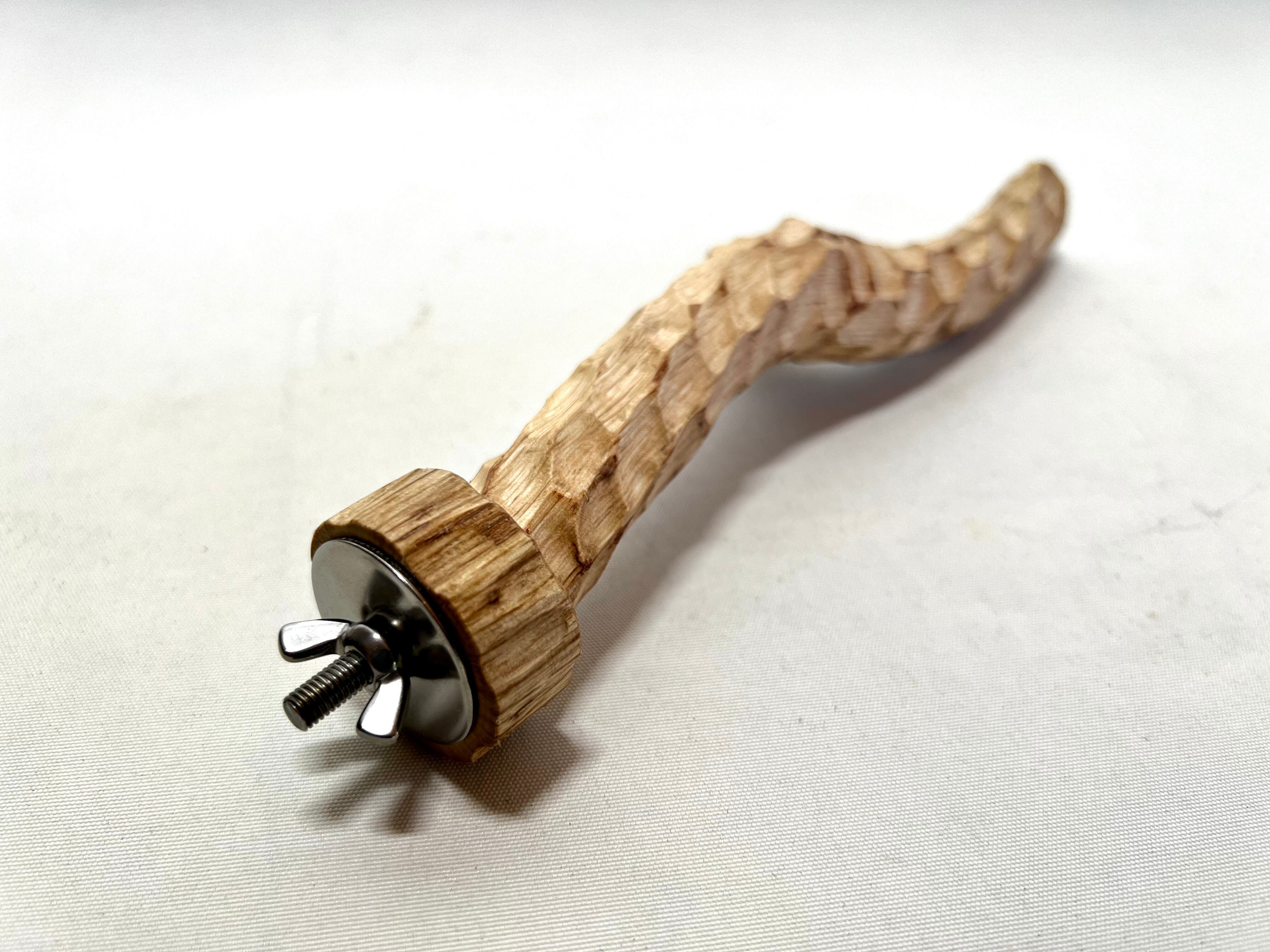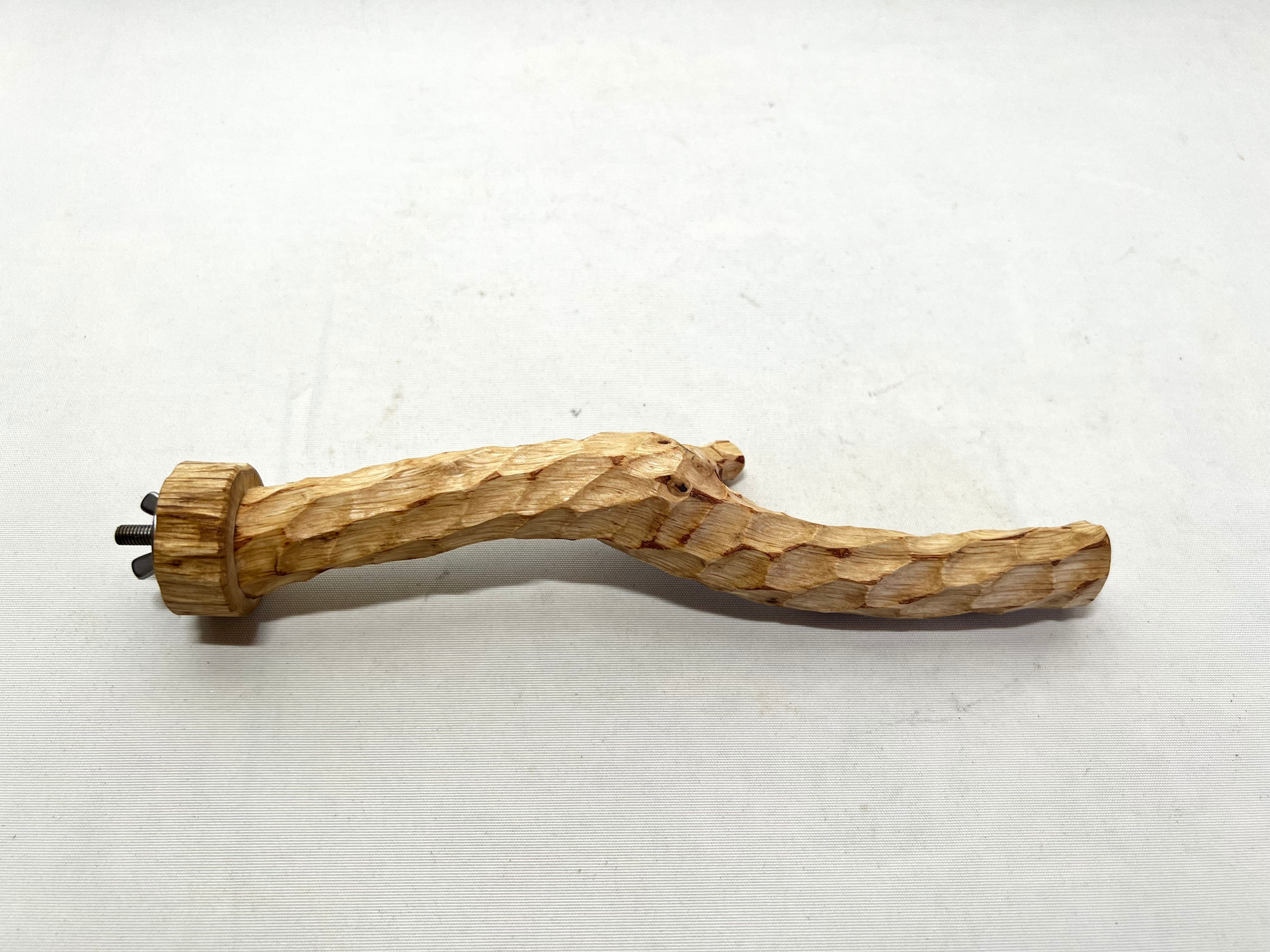 堅い樫を樹皮剥きし、滑り止め効果を高めるために木肌をえぐる多面彫りを施してあります。