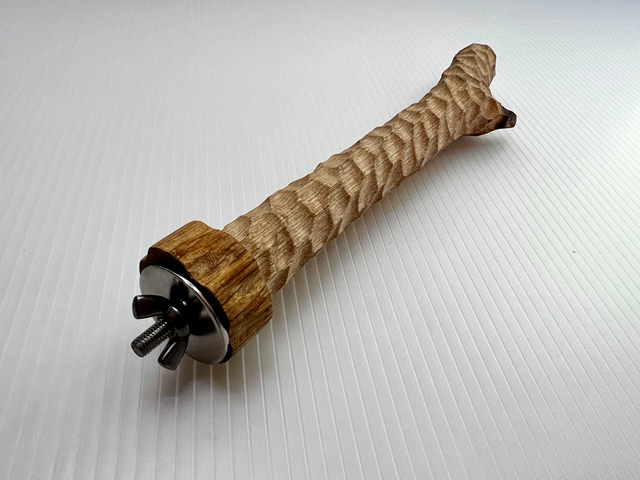 堅い樫を滑り止め効果を高めるため木肌をえぐるように多面彫り加工した特殊なパーチです。