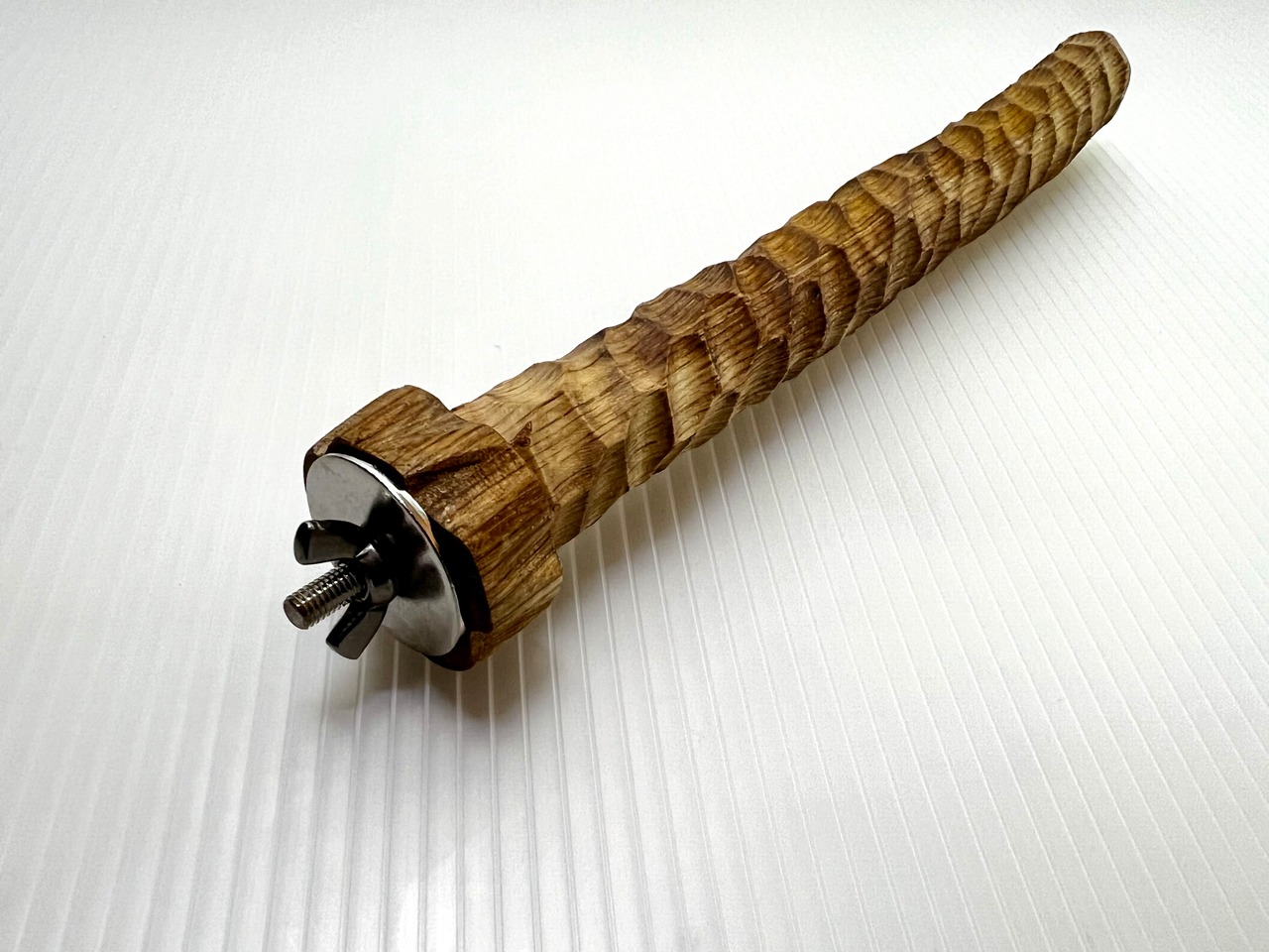堅い樫を滑り止め効果を高めるため木肌をえぐるように多面彫り加工した特殊なパーチです。
